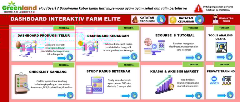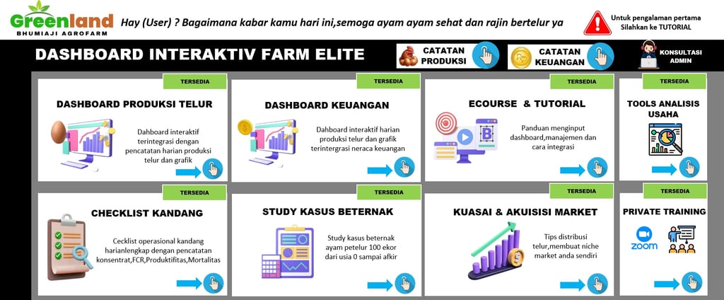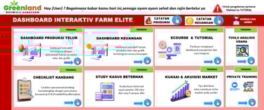 FARM DASHBOARD PRO adalah sistem pencatatan dan analisis berbasis Excel yang dirancang khusus untuk membantu peternak ayam petelur mengelola usaha dengan lebih rapi, cepat, dan akurat. Tidak perlu lagi bergantung pada catatan kertas atau perhitungan manual,semua data penting dapat dipantau dalam satu dashboard interaktif yang mudah digunakan. Dashboard ini dilengkapi 14 parameter produksi dan 13 parameter keuangan yang akan mempermudah Anda memahami kondisi kandang, performa ayam, hingga cashflow usaha setiap hari. Setiap angka ditampilkan dalam bentuk grafik, indikator, dan analisis otomatis sehingga Anda bisa mengambil keputusan lebih cepat dan tepat.